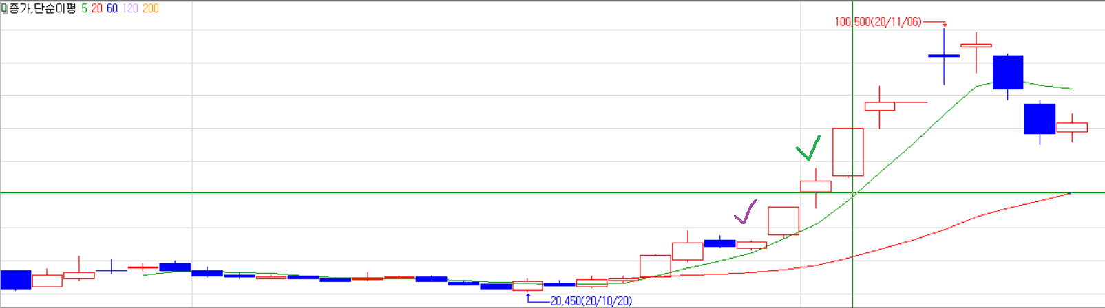 10월 26일 장대양봉을 만든 후 약 3일간 큰 상승없이 횡보를 하기에 10월 29일(보라색 V표시) 매수를 하였고 11월 2일 수익실현을 했고 약 29%의 수익률을 달성하였다.(초록색 V표시)