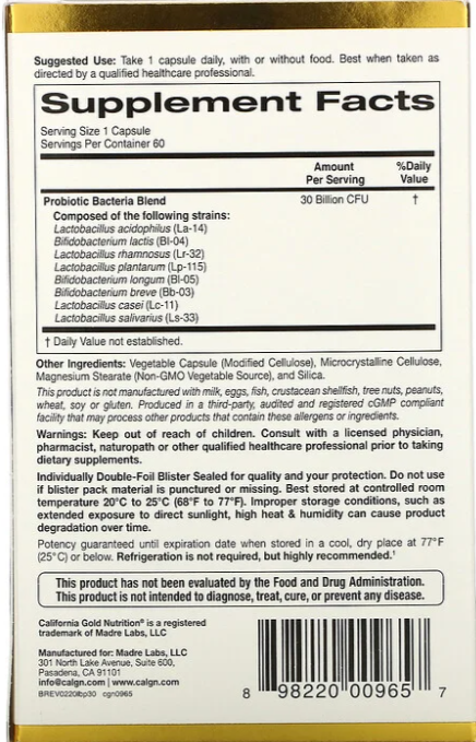 그래서 저는 유산균이 300억이 들어있는 캘리포니아 골드 뉴트리션사의 Lacto Bif Probiotics 제품을 복용하고 있습니다.