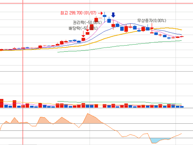 주가는 과매수 구간임에도 불구하고 지속적인 상승을 하다가 결국엔 하락전환하여 순식간에 CCI 지표가 -100 미만이 되었다. 또한 과매도 구간에서 일정기간이 지난 후 방향을 틀어 상승하려는 움직임을 보이고 있다.