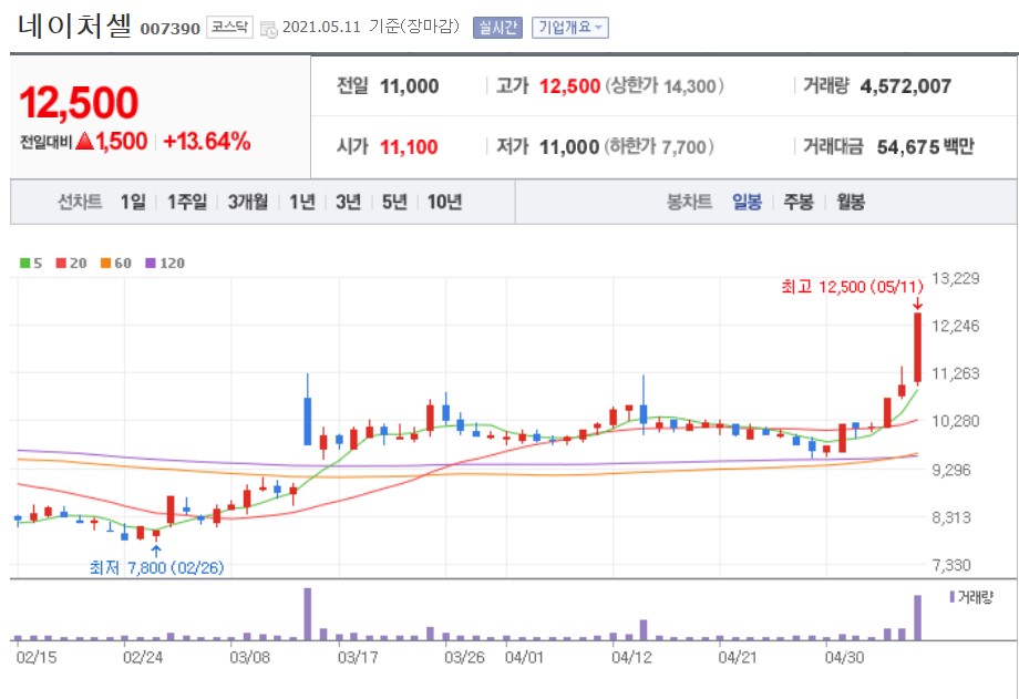 금일 5월 11일 +13.64% 상승한 12,500원으로 마감했습니다.
