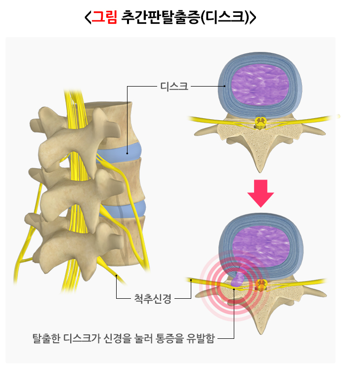 허리디스크(추간판 탈출증)는 척추 사이에 있는 디스크(추간판)가 손상되어 신경을 압박하는 질환입니다.