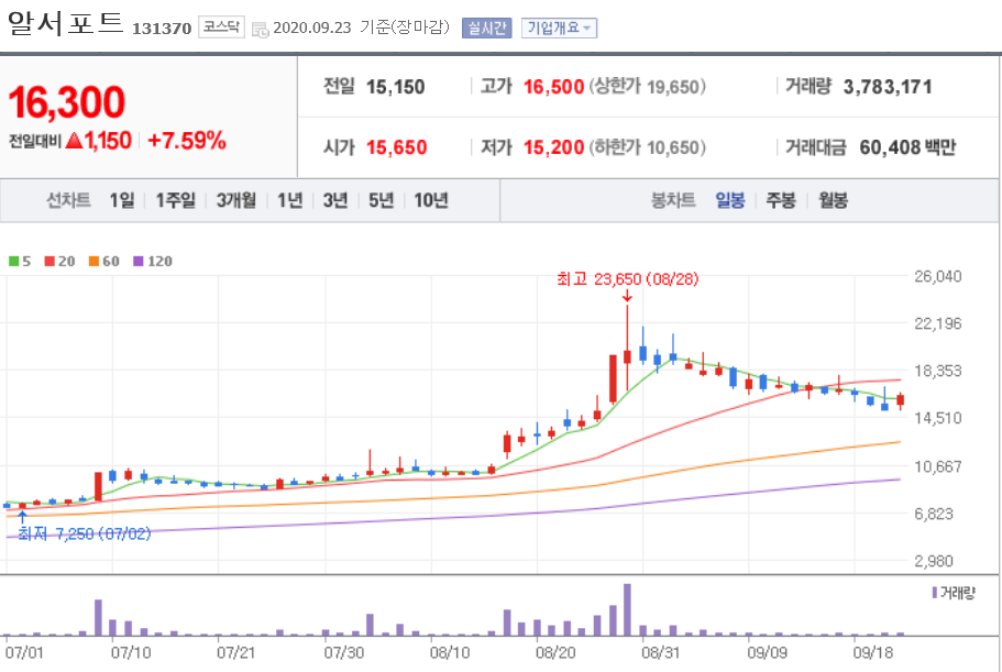 알서포트의 차트를 보면 7월 9일 거래량 실린 장대양봉 후 약 한달간을 20일선 위에서 횡보한 후에 고가 23,000원을 기록하였다. 알서포트는 화상회의 솔루션을 제공하는 업체로서 코로나19로 재택근무를 해야하는 상황에 딱 맞는 종목이었다.